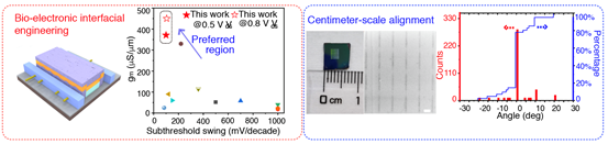 针对上述挑战,他们以组装于DNA模板上的平行碳纳米管(CNT)阵列作为模型体系,研究了界面生物分子组成对器件性能的影响,开发了一种基于固定—洗脱处理流程的界面工程方法。在不改变CNT排列的基础上,有效地去除界面处的金属离子、生物分子等杂质,提升基于生物模板的碳基晶体管性能,展示出良好的开态性能和快速的电流开关转化,从而展现出高精准度生物模板在高性能晶体管领域的应用潜力。基于空间限域效应,他们还发展了大面积取向排列阵列的新方法,并探讨了决定取向排列精准度的关键因素。在高性能电子器件和生物分子自组装的交叉领域,当前方法具有构建基于生物模板大规模电子器件的潜力。兼具电学特性与生物响应特性的高性能电子—生物融合器件也有望在未来的生物传感器与驱动器中得到应用。