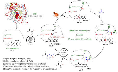 相比于传统化学合成,基于酶催化的生物合成具有反应条件温和、选择性高以及绿色可持续等优势,一直是一个重要的研究领域。然而,酶催化反应类型往往局限于酶本身专一催化的反应,这极大限制了生物合成法能够合成的化学品的种类。