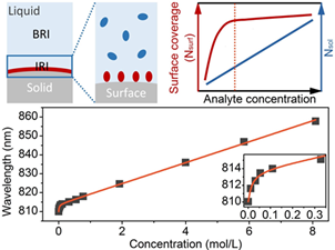折射率是反映光与介质相互作用的重要物理量。基于表面等离激元对周围环境折射率变化的敏感响应,等离激元传感器正在成为一种超灵敏的化学和生物学分析方法。但由于分子与传感器表面的相互作用,待测分子的堆积密度和吸附方向通常与体相不同,导致界面处的折射率不同于体相的折射率,从而改变电磁波与介质相互作用。然而,迄今还未有可以定量描述和测量界面折射率的方法。因此,在实际应用中,常用介质体相折射率来模拟等离激元纳米结构的电磁响应。随着表面等离激元传感器性能的不断提高,其检测限不断降低,同时也发现了越来越多的实验结果无法通过现有理论模型解释。理论和实验的矛盾主要体现在以下两方面:(1)低浓度下等离激元峰值波长对折射率的依赖偏离高浓度的线性;(2)实验上得到的检测灵敏度远超理论预测的极限。