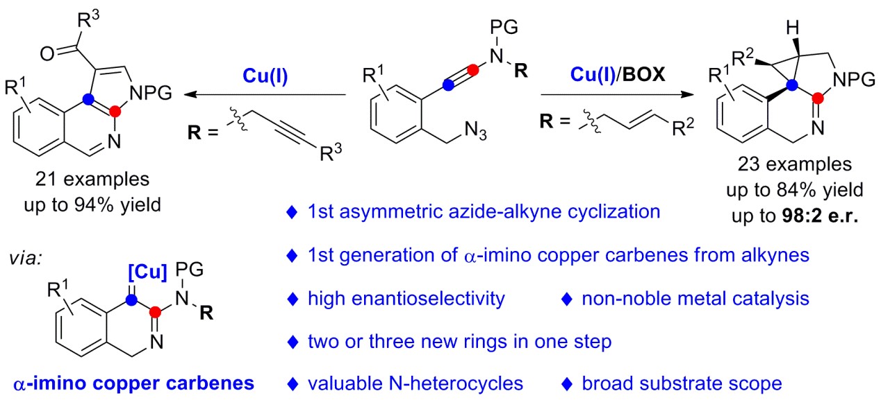我院叶龙武教授课题组在基于炔酰胺的杂环合成方法学研究方面取得新进展,相关成果以“Copper-Catalyzed Azide-Ynamide Cyclization for Generation of α-Imino Copper Carbenes: Divergent and Enantioselective Access to Polycyclic N-Heterocycles” 为题于2020年7月4日在线发表于Angew. Chem. Int. Ed.。