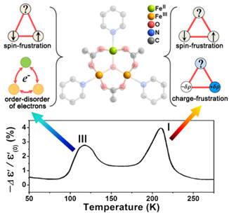 龙腊生教授课题组基于变价三核铁簇合物 [Fe3O(CH3COO)6(py)3](py) (py = 吡啶)中的变价金属离子自旋阻措和电荷阻措共存,成功地实现了近室温下的磁电耦合。他们的实验研究表明,三核变价金属铁离子之间的电荷转移形成电荷阻措,并产生电极化。变温结构分析(特别是低温孪晶结构解析)则证实了顺电态到铁电相的转变是由于金属间的电子转移引起。磁性数据拟合结果表明,化合物中存在强的自旋阻挫,并且自旋阻挫随着外加磁场增强而增强。电场下电子转移计算结果表明,电场诱导了电极化的产生,并促进简并能级的分裂。这项工作首次证实了利用分子基材料中自旋阻挫和电荷阻挫的共同作用可实现化合物的磁电耦合,为单相分子基磁电材料的设计合成提供了新的视角。