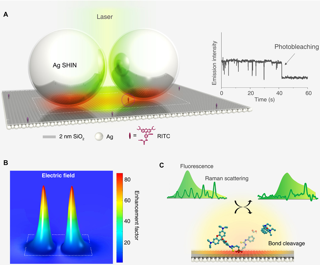 李剑锋教授课题组利用自创的壳层隔绝纳米粒子-等离激元基底,获得了万级的荧光增强因子和百万级的拉曼增强因子,在毫秒时间尺度下,实时获得可以相互关联的荧光发射光谱和拉曼振动信息,成功获得了单个异硫氰酸罗丹明B分子受光照射后,碳碳键断裂,脱去羧基苯基团,生成派洛宁B分子这一系列反应的原位光谱信息。同时,通过数值计算,发现该等离激元纳米腔中,可以在保持量子产率大于0.6的同时,获得~1200倍的Purcell因子。该等离激元结构从单分子水平,为研究光-物质相互作用以及化学反应提供了一种新颖、高效的监测技术。