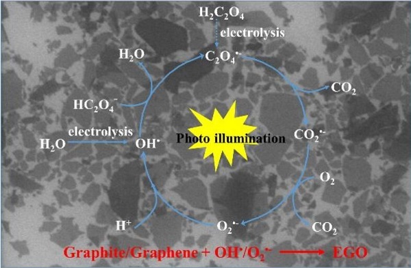 针对电化学剥离石墨过程中生成的羟基自由基(OH•)寿命短、不足以调控EGO氧化度的问题,研究团队提出了一种光电协同的约束自由基加成反应策略,即以草酸根(OA-)为插层离子和共反应剂,通过OA-和OH•的系列化学转化过程,将OH•约束在石墨-石墨烯/溶液界面并实现其再生,有效地提高了OH•的界面浓度,使电解石墨烯和OH•之间的自由基加成反应得以充分进行;同时,由于草酸自由基具有光活性,光电协同大幅提高了OH•的再生效率,所制备EGO氧化度可控,层数少,尺寸大。红外光谱数据显示该EGO富含羟基和环氧基,而羰基和羧基的谱峰极其微弱,表明其晶体结构非常完整。