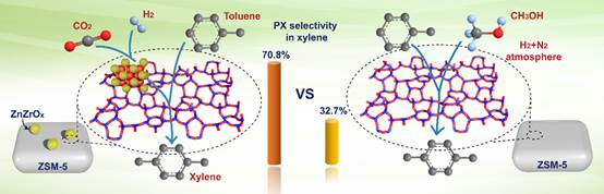 PX是石化工业的基本有机化工原料之一,主要用于生产三大合成材料—合成树脂、合成纤维和合成橡胶。随着我国下游产业的快速发展,PX的需求量迅猛增长,进口依存度大于50%。采用甲醇与甲苯选择性烷基化反应制PX是一条热门且较为经济的技术路线,虽然,国内外众多研发机构和公司投入大量的人力物力研发,但其反应温度高达420~480 °C,与甲醇制烯烃(MTO)反应温度接近,容易产生副反应。该反应温度较高的主要原因在于甲醇较难转化为活性烷基化基团。袁友珠教授课题组在前期开展CO2加氢制甲醇的研究中(Appl. Catal. B: Environ. 2019, 251, 119; Catal. Sci. Technol. 2018, 8, 1062)注意到CO2催化加氢制甲醇经甲酸盐路径反应机理的甲氧基中间体。因此,他们提出使用CO2和H2替代甲醇作为甲苯烷基化试剂,利用CO2和H2在相对较低温度下生成的甲氧基中间体(无需经甲醇)直接与甲苯烷基化。