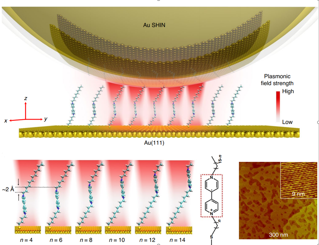该工作是在李剑锋教授和中国科学技术大学罗毅教授共同指导下完成的。 实验部分主要由李超禹(论文第一作者,已毕业博士)、温宝英(在读博士)、李松波(已毕业硕士)完成,复旦大学段赛研究员(论文共同第一作者)和陈舒(已毕业博士)进行了局域场光谱理论计算。谢立强(已毕业博士)和毛秉伟教授帮助完成了扫描探针显微镜实验。浙江师范大学周小顺教授和王亚浩老师提供了自组装膜表征方面的重要帮助。印度的Kathiresan、叶龙武教授课题组和浙江大学陆展教授课题组在分子合成方面提供了重要帮助。瑞士伯尔尼大学Wandlowski教授和田中群教授为该工作提供了指导。该研究工作得到国家自然科学基金、国家重点研发计划、安徽省量子信息技术引导专项等的资助和支持。
