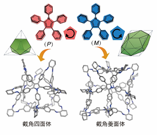 分子多面体化合物因其独特的结构、限域空间及在催化、分子识别等领域的应用而备受关注。近些年来,化学家们构筑了形状、尺寸、功能各异的分子多面体结构。但由于基本设计原则的匮乏,新多面体结构的发现仍面临挑战。近年来,曹晓宇-杨柳林联合团队借鉴数学中的面方向性多面体(Face-Rotating Polyhedra)概念,发展了以三聚茚、氮杂三聚茚、四苯乙烯等为基元的一系列分子面方向性多面体组装体系,将组装基元的二维手性传递至分子多面体的三维手性,是一类全新的分子手性形式 (Nat. Commun., 2016, 7, 12469; Chem. Commun., 2018, 54, 4685; J. Am. Chem. Soc., 2017, 139, 18142; Chem. Sci., 2018, 9, 8814)。