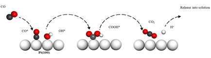 在实验结合理论的研究基础上,提出了合理的CO电氧化过程。在高氯酸的CO饱和溶液中,吸附态的CO*通过L-H机理与吸附态的OH*经由COOH*过程,COOH*分解产生CO2释放到溶液中。相反,在Pt(110)单晶表面,获得了不同的实验现象,进一步结合吸附构型和理论计算,解释了其活性较差的原因。该工作系统地研究了Pt(hkl)单晶电极表面CO的吸附和电氧化过程,为抗毒化和高效催化剂的设计提供了新的视角。