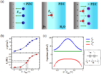 双电层对于电化学界面过程的意义重大,但目前依然对其缺乏足够的微观认知。在该工作中,结合第一性原理分子动力学方法和课题组自身发展的电极电势计算方法(计算氢标准电极法,Phys. Rev. Lett. 2017, 119, 16801),程俊教授等人模拟得到了不同电位下的Pt(111)/水溶液界面结构,在深入分析结构的基础上发现了化学吸附水的覆盖度在Pt(111)表面随电位变化遵循Frumkin等温吸附的规律。更进一步,通过理论推导证明了该化学吸附水覆盖度随电位的变化会对电化学界面造成一个负电容的贡献,这拓展了经典的双电层模型对于电化学界面的理解。同时,该负电容能够明显增大紧密层电容,并且在零电荷电位附近形成一个峰,这很好得解释了电化学实验中观察到的“铃铛状”的微分电容曲线,解决了这一困扰基础电化学工作者多年的一个疑问。该工作将为深入理解界面电催化的微观机制提供重要帮助,并有望为双电层超级电容器的设计提供了新思路。