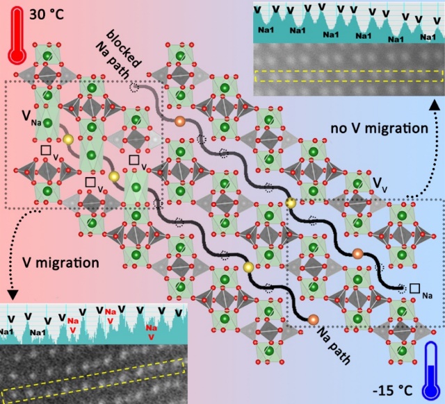 基于此,杨勇教授课题组和美国阿贡国家实验室陆俊博士团队合作,结合宽温区原位XRD、非原位X-射线吸收谱、软X-射线吸收谱、球差校正扫描透射电子显微镜等表征手段,首次发现该反常现象源自NVCP中过渡金属离子V的迁移。即电池在常温循环过程中由于部分V迁移到Na位,导致Na扩散路径的堵塞和“诱导效应”的弱化,从而导致电池性能的衰退。该研究进一步提出并证明了过度嵌Na(即低压放电)可促使V离子迁回原位, 改善电池的性能。该研究将引起人们对聚阴离子框架中过渡金属离子稳定性及其对材料电化学性能影响的关注。