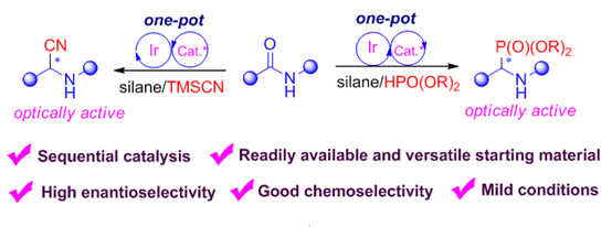 近日,黄培强教授课题组在前期金属铱催化的仲酰胺的还原官能化工作(Angew. Chem. Int. Ed. 2018, 57, 11354)基础上,采用过渡金属与小分子串联催化的策略,发展了金属铱与手性硫脲串联催化的仲酰胺的不对称还原氰基化和还原磷酰化反应。这是酰胺的首例催化不对称还原官能化。反应具有较好的底物适用性和官能团兼容性,为构建具有高光学纯度的手性α-氨基腈和α-氨基磷酸类化合物提供了一种简便的新方法。同时,过渡金属与小分子共催化策略的成功,也为新型酰胺不对称转化反应的发展提供了思路。