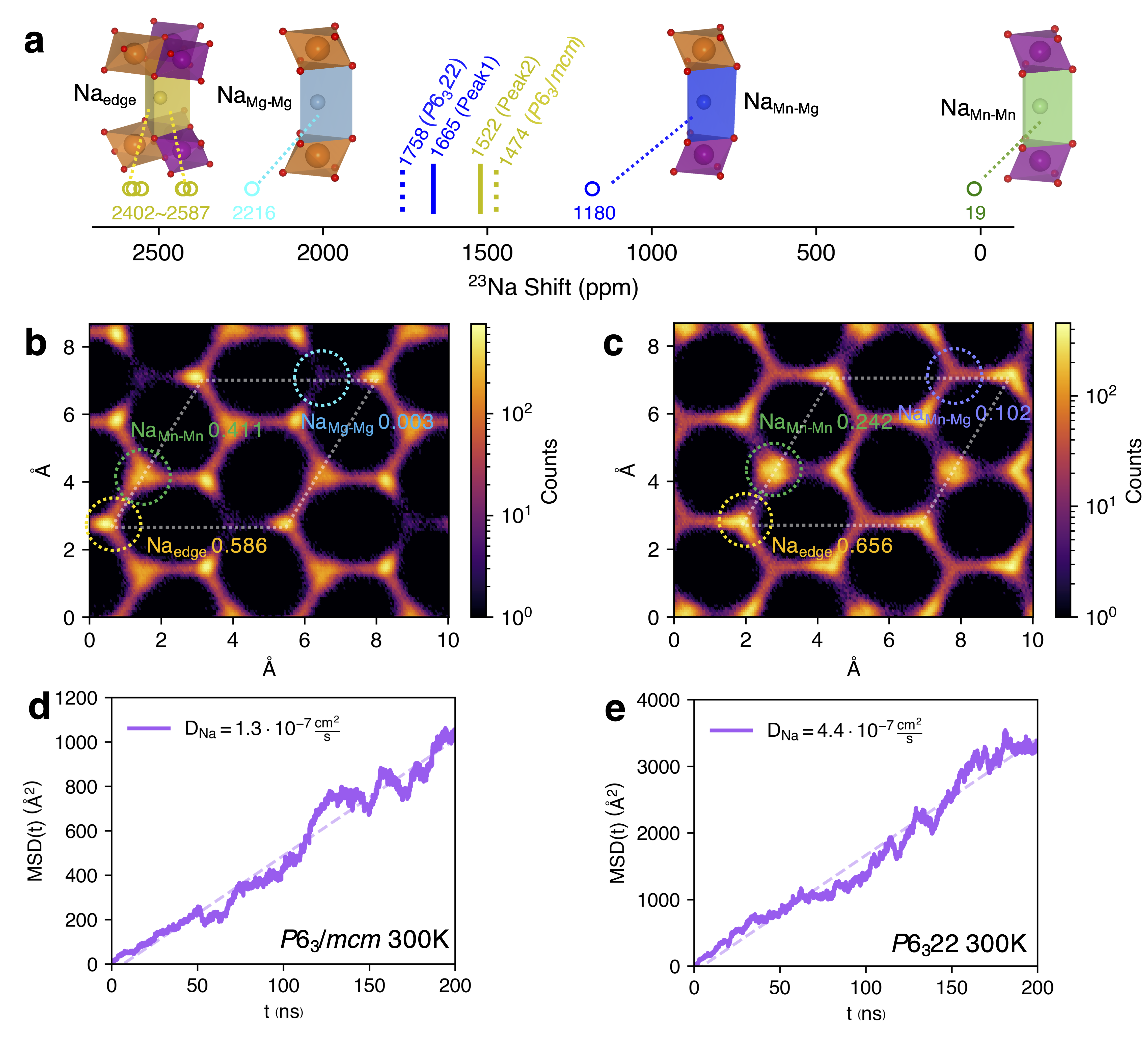 课题组采用基于深度神经网络的机器学习势函数并运用其进行分子动力学模拟,即深度势能分子动力学 (DPMD)。 DPMD不仅可以达到与常规 DFT 计算相同的计算精度,还可以加快约百万倍的计算速度。对于P2-Na2/3(Mg1/3Mn2/3)O2,常温下 200 纳秒的 DPMD 模拟才能得到 Na+ 收敛的精确占位,据其计算得到的 NMR 位点平均位移很好的符合了实验测量值,得以指认低位移峰对应P63/mcm,高位移峰对应 P6322,且确定了P6322 的含量为  。DPMD模拟预测了Na+在中P6322中的扩散更快,这点也被 23Na 核弛豫时间的测量所确认。