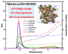 研究人员对比了不同浓度LiTFSI单盐TMS/EA基电解液、LiTFSI和LiDFOB双盐TMS/EA基电解液以及相应的不同浓度局部高浓度电解液的理化性质,结合傅里叶变换红外光谱(FTIR)、核磁共振锂谱(7Li-NMR)以及分子动力学(MD)模拟等揭示了低浓度电解液、高浓度电解液以及局部高浓度电解液的微观结构差异性。结果表明:随着电解液浓度的提高,锂盐阴离子与锂离子的相互作用增强,其配位数显著增加到2个左右;而稀释剂的加入并不会改变原溶剂和阴离子与锂离子的配位情况,只是打破了溶剂之间的三维网状铰链溶液结构,从而有效降低了粘度。此外,研究人员还利用MD模拟及7Li-NMR等表征手段对高浓度电解液到局部高浓度电解液的优化转变的化学本质进行了探究,发现钝化膜的生成对提高电解液氧化稳定性至关重要,而稀释剂和添加剂的协同作用,能进一步实现提升电池性能。该研究工作对新型局部高浓度功能电解液的设计提供了更多思路,对高电压和低温电解液的设计具有一定的借鉴意义。