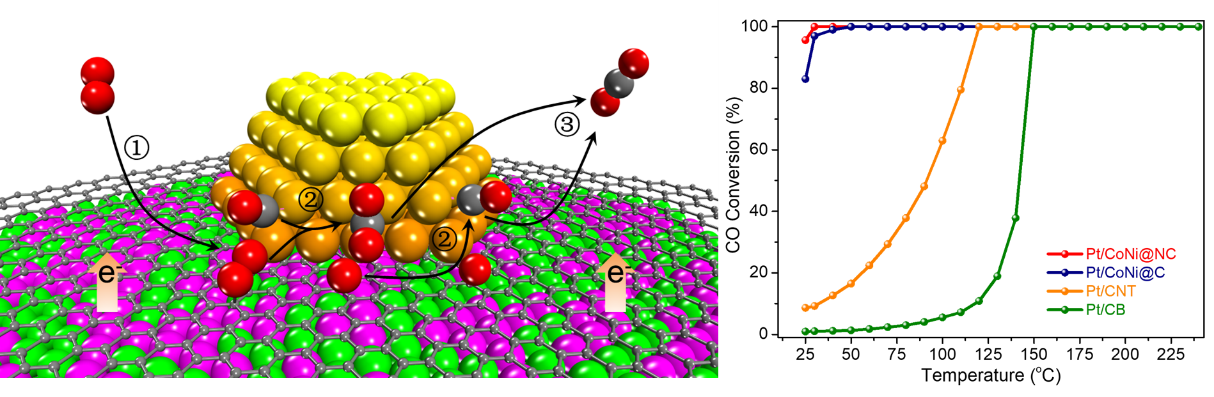 本工作中,邓德会团队将“铠甲催化”的概念成功应用在室温CO催化氧化体系中。研究团队通过合成策略的创新,将Pt纳米颗粒负载在石墨烯封装的CoNi铠甲催化剂(PtǀCoNi)上,利用石墨烯将CoNi纳米颗粒与CO氧化反应中的富氧气氛隔绝,使CoNi合金在反应中保持金属态并防止过度氧化,而CoNi的电子可以穿透石墨烯,进而有效调变了Pt纳米颗粒和石墨烯界面处的电子结构,实现了室温CO高效氧化。该催化剂在室温下可实现近100%的CO转化率,其性能远高于Pt/C和Pt/CoNiOx催化剂的性能。实验和理论计算表明,O2可以在Pt-石墨烯封装CoNi纳米颗粒的界面处吸附活化,而CO在Pt纳米颗粒上吸附,不与O2吸附产生竞争,从而有效促进了氧气的活化和后续的CO氧化。该工作是“铠甲催化”概念的成功拓展,为室温、高效的新型催化氧化催化剂的设计提供了新思路。