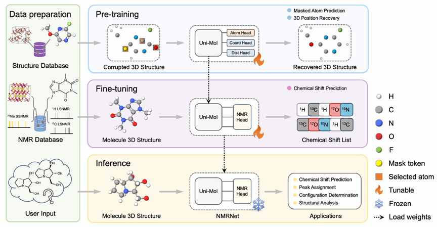 左侧:数据准备模块,提供结构和NMR数据;右侧上方:预训练模块,利用结构信息进行自监督学习;右侧中部:微调模块,进行有监督的NMR化学位移预测;右侧下方:推理模块,将模型应用于多种实际任务。