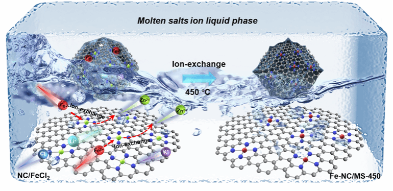 为突破上述瓶颈,研究团队发展了一种低温熔盐离子交换策略,通过LiCl/KCl熔盐介质中动态迁移的过渡金属离子(Fe2+、Co2+等)与氮掺杂碳(NC)载体上的Zn²⁺直接置换,在450 °C低温下一步形成高密度、原子级分散的M-N4活性位点。该策略构建了类似“离子熔池”的反应环境,使Fe2+能够直接取代Zn-N4位点的Zn2+,绕过高能耗的氧化物还原步骤,从源头抑制金属团聚。基于该方法制备的催化剂,单原子金属负载量达到3.7-4.7 wt.%,较传统方法提升2倍以上,且适用于Fe、Co、Cu、Ni等多种金属。特别是所合成的Fe4.5-NC/MS-450催化剂在质子交换膜燃料电池(PEMFC)中表现出优异活性,峰值功率密度达1.12 W cm-2(1.0 bar,80 °C),为高效燃料电池催化剂设计提供了新思路。
