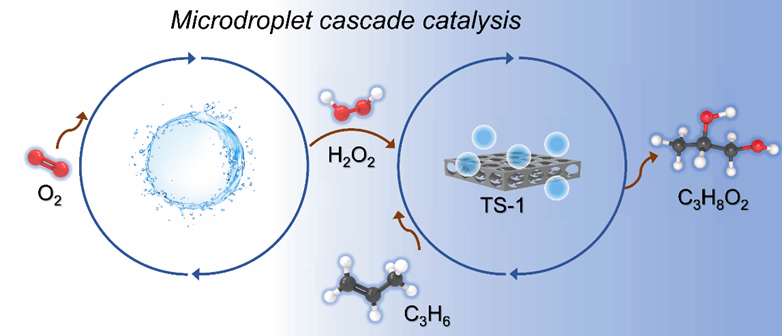 丙二醇作为一种重要的化工原料,广泛应用于不饱和聚酯树脂、医药制剂及防冻剂等产品的生产。目前,其工业化制备主要依赖于能耗较高的两步热催化工艺。尽管通过双氧水直接氧化丙烯制备环氧丙烷,再经酸解生成丙二醇的路径具有绿色合成潜力,但该工艺仍面临两个关键挑战:一是过氧化氢的原位绿色高效合成困难;二是底物-催化剂亲疏水性失配导致的传质限制问题。这些因素共同限制了催化反应活性与效率。针对上述问题,研究团队提出了一种基于微液滴的级联催化方法,在常温常压下实现了丙二醇的高效高选择性合成。该方法通过微液滴均相催化原位生成过氧化氢,并与固相催化剂TS-1在三相界面(固-液-气)上协同作用,完成丙烯的选择性氧化。在优化条件下,丙二醇的生成浓度可达680 μM,选择性达88%。研究表明,该方法通过界面均相与异相催化的协同效应,利用微液滴的界面特性及超高比表面积,有效强化了反应物在三相界面的富集与转化过程,从而显著提升了反应活性和选择性。此外,该系统采用廉价易得的原料,配合简化的反应器设计,展现出良好的可扩展性。结合技术经济分析,研究进一步评估了该方法的工业化潜力,为微液滴技术在绿色化工过程中的产业化应用奠定了基础。