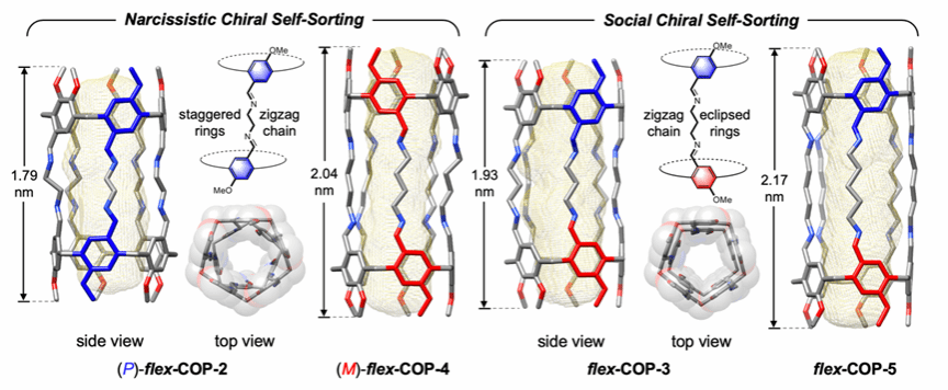该研究采用动态共价化学策略,以双缘去对称化柱[5]芳烃为核心构筑基元,通过精确调控α,ω-二氨基烷烃连接链长度,实现了对管状空腔尺寸和手性特征的精准编程。特别值得注意的是,研究发现了碳链奇偶性诱导的手性自分类现象:偶数碳链自发组装成同手性对映体,而奇数碳链则形成异手性内消旋结构。通过高分辨单晶X射线衍射分析,团队成功解析了这种现象的分子机制——由烷烃链构象能量精确调控的手性自分类模式。