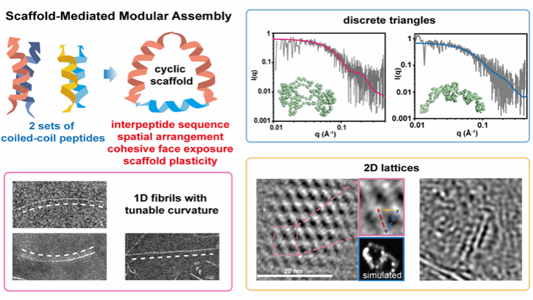 受有机反应环形中间体的启发,课题组提出了“多面环调控组装策略”。该策略通过多肽间交联形成可控环形结构,基于环内多肽的组成、空间排布、粘合面暴露以及环柔性,实现对自组装结构的预先设定。基于此,课题组仅利用两组二聚卷曲螺旋多肽,便成功构建了结构明确、形貌可调的多维度组装体,包括:纳米三角形、网格纳米片、曲率可调纳米线。这些研究结果为分子组装的理性设计提供了全新视角。