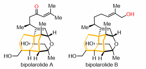 Bipolarolides A 和B是华中科技大学张勇慧教授课题组2019年首次分离出的Ophiobolin家族衍生的具有新型骨架的二倍半萜类化合物。其具有[3.3.1]桥环骨架,包含3个连续的手性中心以及一条手性侧链,分子结构十分复杂。其中Bipolarolide A展现出重要的降胆固醇活性(IC50=2.5 µM)。