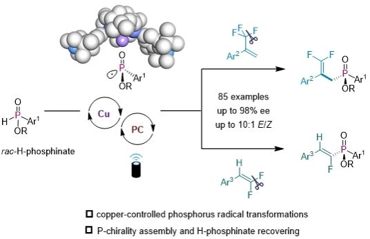 基于课题组前期在相关领域的研究积累(J. Am. Chem. Soc. 2025, 147, 1767;J. Am. Chem. Soc. 2024, 146, 10857; J. Am. Chem. Soc. 2024, 146, 24515;Nat. Synth. 2023, 2, 766;Nat. Commun. 2023, 14, 6366等),本研究发展了一种光/铜协同催化新策略,首次实现了外消旋H-次膦酸酯与α-三氟甲基烯烃/偕二氟烯烃的高效动力学拆分,成功构建磷手性中心。该反应展现出优异的底物适用性,共获得85种含氟磷手性次膦酸酯产物,其对映选择性ee值高达98%。机理研究与理论计算揭示了反应经历三阶段的立体化学接力过程:首先,手性铜催化剂对H-次膦酸酯进行选择性识别;随后,经光诱导配体-金属电荷转移过程生成磷中心自由基;最后,在光氧化还原催化作用下实现构型保持的C–P键形成。该策略不仅实现了磷中心自由基的立体可控转化,也为面临立体构型快速翻转挑战的杂原子不对称反应研究提供了光/金属协同催化的新思路。