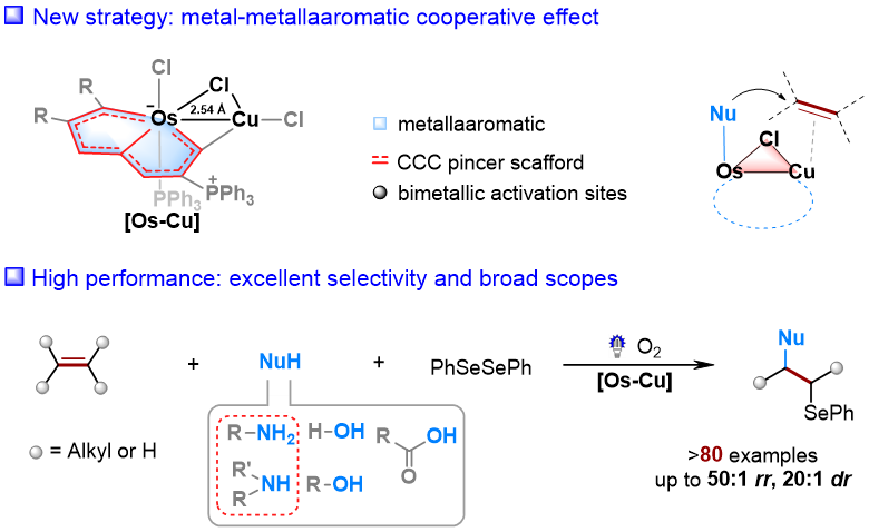 含金属-金属相互作用的双金属催化剂能通过两个金属的协同作用发挥比单一金属更有效且独特的催化作用。本工作以具有芳香性的“碳龙配合物”为催化剂骨架,引入第二种金属,提出了一种金属-金属杂芳环协同作用的全新催化策略,用于非活化烯烃的双官能团化反应,合成了80多个具有潜在生物学意义的有机硒化合物。通过对关键中间体的分离及控制实验,揭示了该独特双金属催化剂的三个作用:(i)锇中心配位并活化亲核试剂;(ii)锇-铜双金属的协同效应促进了亲核试剂与烯烃的反应并控制其化学与区域选择性;(iii) 金属杂芳环骨架提高了锇的催化活性并稳定了中间体。这种以金属杂芳环骨架为基础的双金属策略有助于灵活地调控金属-金属之间的协同作用,展现了碳龙配合物在催化领域的应用潜力,也为双金属催化剂的设计提供了一个新的视角。