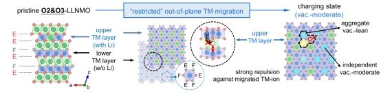 富锂层状氧化物(Li-rich)因阴离子氧化还原反应可提供超高容量,是下一代高能量密度锂离子电池极具潜力的正极材料。然而,充电时锂离子从过渡金属(TM)层脱出会产生空位,这些空位会驱动TM离子发生不可逆的“面外迁移”,从TM层迁移至锂层。这种迁移不仅会阻塞锂离子扩散通道,还会诱发TM层内形成空位团簇,引起晶格氧失稳、氧气释放以及严重的不可逆畸变,最终导致循环过程中容量的快速衰减和电压的持续下降,严重阻碍其实际应用。