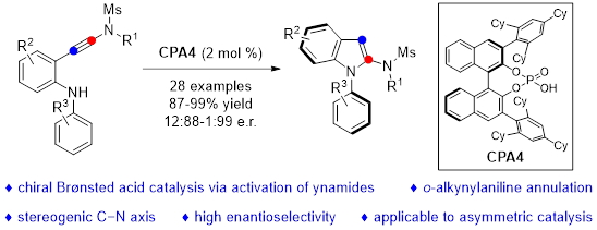 近年来,基于炔酰胺的不对称催化反应受到越来越多的研究关注。其中,绝大部分不对称催化炔酰胺的反应构建的是中心手性化合物且需要使用过渡金属催化剂。通过阻旋作用产生的轴手性是手性中很重要的一部分,相应的轴手性化合物可作为不对称催化反应的有机催化剂或金属的配体。目前,不对称催化炔酰胺合成轴手性化合物尽管已有几例报道,但是这些反应均需要使用贵金属催化剂且只能获得中等对映选择性。因此,发展新型非金属催化炔酰胺构建高对映选择性的轴手性分子备受期待。