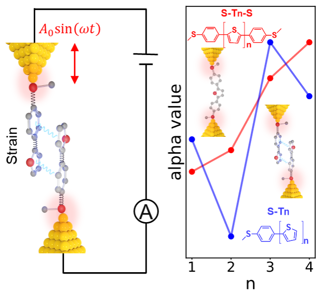 近日,洪文晶教授课题组通过发展新的单分子电学表征仪器方法,在单分子尺度对基于p-p堆叠的二聚体超分子结施加亚埃级(0.2 Å)的高频机械振荡,以此表征了一系列寡聚噻吩二聚体中超分子相互作用的力学应变分布,并结合理论计算揭示了这一应变分布出现奇偶效应的根源是由于奇数和偶数个噻吩环所具有的不同构象变化自由度的差异。该工作通过建立对超分子相互作用应变的表征方法和仪器技术,提供了从单分子尺度研究分子间相互作用的独特视角,也为从单个分子乃至单个结构单元层次理解、设计和调控超分子相互作用提供了新的思路。