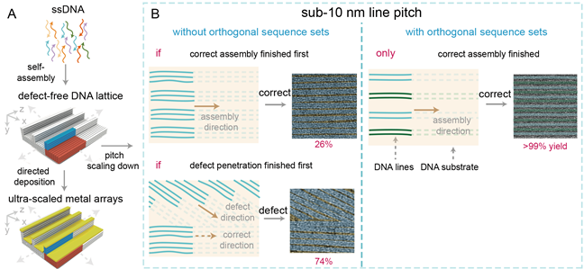 高分辨三维纳米加工技术是先进节点半导体器件发展的基石,特别是面向未来亚1纳米器件节点的需求,需要批量制备具有亚10纳米特征周期的低缺陷模板。自组装技术,特别是核酸自组装,具有突破极紫外光刻分辨率极限的潜力,并已初步应用于制备10-20纳米特征周期的碳基、硅基器件。但在亚10纳米特征周期下,熵致高维晶格缺陷(如线位错或者晶界)大量出现,制约了自组装结构的完整度和正确性。