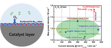 质子交换膜燃料电池 (PEMFCs) 的商业化应用高度依赖高效﹑低成本的催化剂来驱动缓慢的阴极氧气还原反应 (ORR)。然而,以铂 (Pt) 为代表的铂系金属催化剂 (PGM catalysts), 虽然具有最佳的ORR性能,但价格昂贵,而且,其有限的储量与强劲的市场需求之间的矛盾日益突出,限制了PEMFCs大规模推广。热解型铁氮碳(Fe-N-C)材料被认为是质子交换膜燃料电池中活性最高的非铂电催化剂。Fe-N4位点是Fe-N-C的活性中心,目前大量的研究集中在提高Fe-N4位点密度。然而,当活性位密度提高时,活性位的利用率却很低。文献报道的高性能催化剂活性位点的密度达到5 × 1019 sites/g时,位点利用率普遍低于12%,成为高性能质子交换膜燃料电池应用的主要障碍。