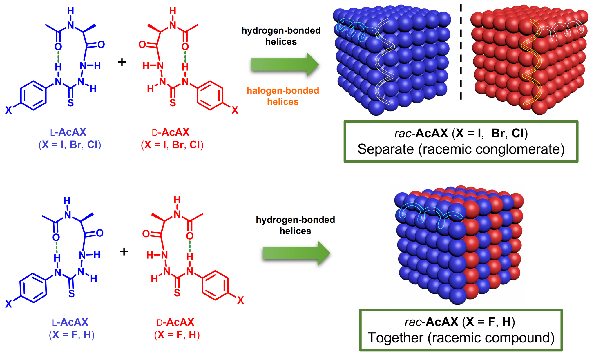 江云宝教授课题组近年来在折叠短肽基超分子螺旋的构筑研究中取得系列进展 (J. Am. Chem. Soc. 2017, 139, 6605; Nat. Commun. 2019, 10, 3610; Org. Biomol. Chem. 2021, 19, 6397; Chem. Commun. 2021, 57, 1802; Chem. Commun. 2021, 57, 12562; Chem. Commun. 2022, 58, 6461),发现超分子螺旋形成中呈现同手性特征,提出系因此而保障折叠结构单元螺旋性的有效延展之故。据此,形成了构筑二维或三维超分子螺旋以驱动三维同手性延伸、促进手性自发拆分结晶的研究设想。为此,设计将乙酰丙氨酸模型分子衍生为乙酰丙氨酰胺基硫脲,后者含有β-转角结构而呈折叠构象,赋予转角结构之间氢键相互作用的特性;续于分子中苯基硫脲的苯环对位引入卤素原子,折叠分子间因此又具有穿越转角结构的卤键作用可能。固体圆二色和红外光谱、手性色谱、X-射线粉末和单晶衍射等实验表明,修饰以碘、溴和氯等卤素原子的折叠短肽衍生物分子间具有强的卤键作用,可同时形成氢键和卤键超分子螺旋,构成二维正交螺旋,驱动结晶过程中的三维同手性延伸,实现外消旋体发生手性自发拆分结晶;修饰以氟原子或不含卤素原子的折叠短肽衍生物分子无法提供卤键作用,仅形成一维氢键超分子螺旋结构,外消旋体发生共结晶。该项研究为理性构筑手性自发拆分结晶体系提供了新的思路。