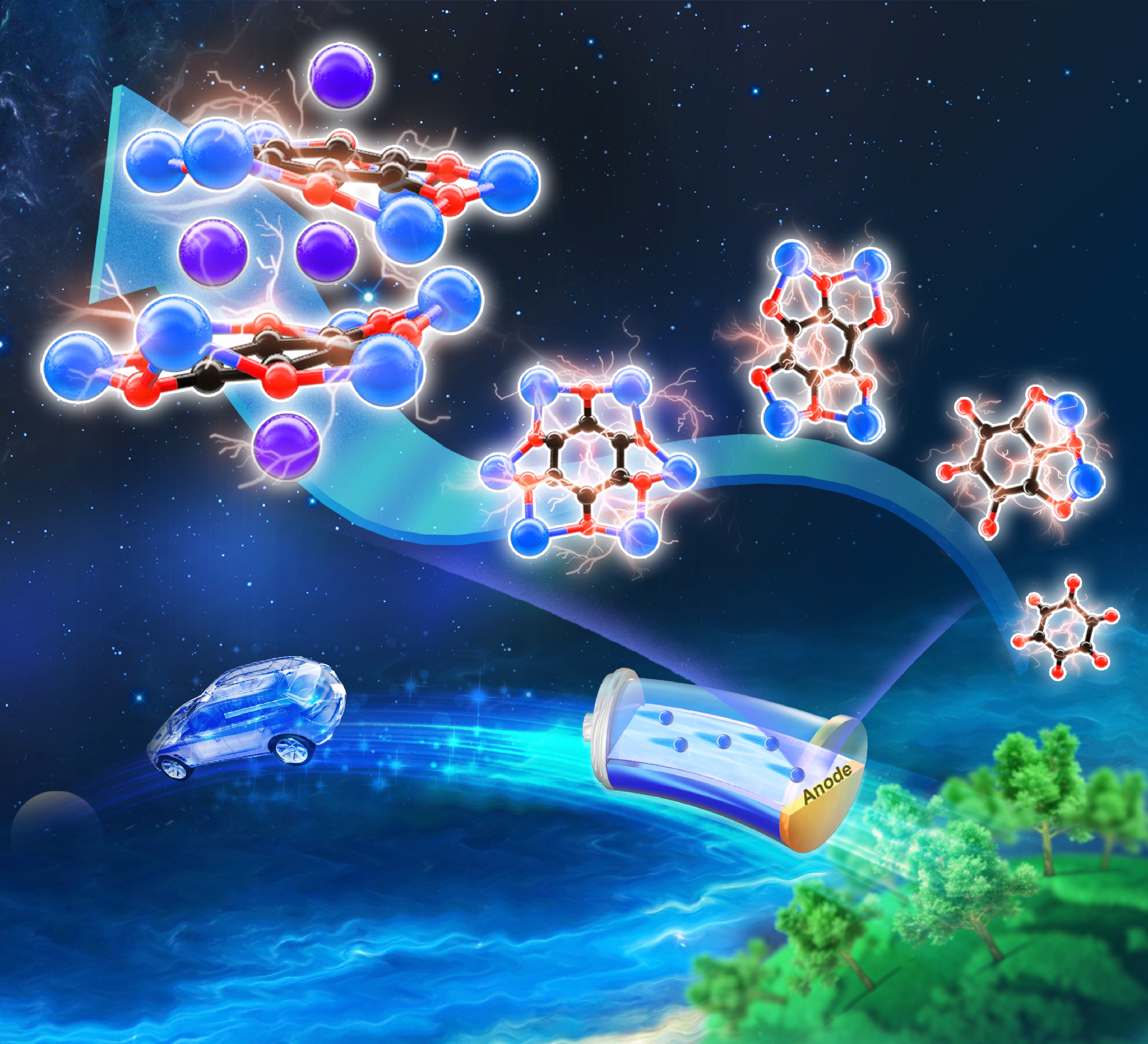 用含碳、氢、氧等元素的有机电极材料取代传统无机负极材料,是未来绿色锂离子电池极具吸引力的方向之一。当前,作为锂离子电池(LIBs)电极材料的有机分子存在电子电导率低、氧化还原动力学迟缓、在碳酸酯类电解液中溶解度高以及倍率性能差等突出瓶颈问题,限制了其在电化学储能中的实际应用。针对上述问题,研究团队致力于发展高比容量和高倍率的新型有机电极材料及其制备技术,已取得阶段性研究成果(Adv. Mater. 2021, 33, 2104039,Adv. Energy Mater. 2018, 8, 1802273)。