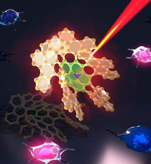 团队基于前期通过对巴基碗的π-体系拓展策略合成“富勒手”分子和碳纳米锥分子的研究基础(Nat. Commun. 2019. 10, 485; Sci. Adv. 2019; 5 : eaaw0982),针对多重螺烯分子的近红外荧光发射偏弱的问题,选取光物理性质优异的氮杂巴基碗作为起始原料,通过3步有机反应成功合成了以氮杂巴基碗为新内核的氮杂五重[7]螺烯分子(N-Q7H)。X-射线单晶结构表明,N-Q7H呈现出螺旋桨状的拓扑结构,由2个氮杂[7]螺烯、3个碳[7]螺烯和一个氮杂巴基碗内核构成。N-Q7H展现出从紫外到近红外的全光谱吸收和强的近红外荧光(荧光量子产率达到28%)。理论计算研究表明,N-Q7H优异的光物理性质主要源于螺烯与氮杂巴基碗杂化后打破了电子结构对称性,使得HOMO−LUMO轨道以及基态到激发态的跃迁变得允许,并伴随着辐射衰减的增加。考虑到N-Q7H因高度扭曲螺旋结构在极性溶剂中表现出良好的分散性以及高的荧光量子产率,团队对N-Q7H的细胞成像进行了研究,发现N-Q7H具有良好的细胞穿透性和生物相容性,在633 nm激光照射下,经N-Q7H处理的HeLa细胞产生明亮的近红外荧光,拓展了多重[n]螺烯在生物成像方面的应用。