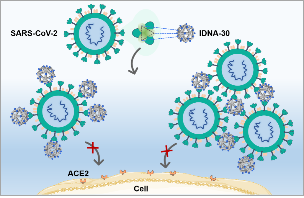 结构生物学家揭示了SARS-CoV-2 Spike蛋白的三聚体形式以及其在SARS-CoV-2颗粒上分布的随机性,并提出三聚体的构象变化将影响其侵染程度。因此,本研究采用正二十面体DNA折纸框架构建具有精确空间位置的SARS-CoV-2中和适体(IDNA-30),形成拓扑多位点中和,阻断Spike三聚体与宿主ACE2的相互作用。首先,IDNA-30的每个三角形平面由三个精确位置的适体组成,它们较好的匹配新冠病毒的Spike三聚体拓扑结构,从而形成多价空间模式中和。其次,正二十面体作为具有最多正三角形面的正多边形,可通过多个结合位点和大小适中的尺寸,诱导病毒聚集,进一步提高阻断效率。再者,每条边四个双螺旋的设计使得刚性的IDNA-30不仅可以形成空间屏障,阻断病毒与宿主细胞结合,还可以锁定Spike三聚体,限制其构象转化,从而进一步抑制病毒膜融合。这种空间匹配的中和策略为组装中和试剂以增强新冠病毒感染的抑制作用和对抗其他致病病毒提供了一个新的方向。