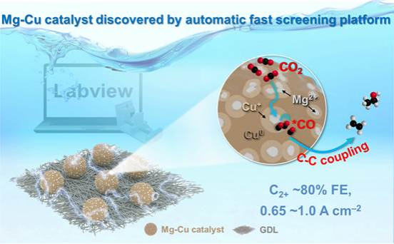 利用可再生电能驱动CO2电催化还原制高值多碳化学品,如乙烯、乙醇,不仅可以实现CO2的高值化利用,还可实现可再生电能到化学能的存储。高效电催化剂的研发是该领域的研究重点之一。CO2电催化还原制多碳产物中,铜基催化剂是唯一兼具高活性和高选择性的一类催化剂。目前已发展出掺杂、合金化、表面分子修饰等多种策略用于提高铜基催化剂的性能,但由于催化剂组成和反应机理的复杂性,催化剂开发过程往往需要大量反复试验来筛选,研发效率较低,而构建催化剂的自动化快速筛选平台,可以显著提高高性能催化剂的研发效率。