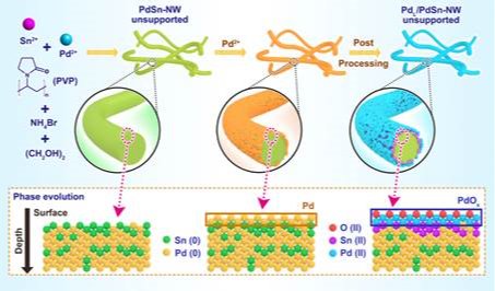 过氧化氢(H2O2)是一种绿色且不可或缺的氧化剂,被广泛用于多个领域。目前,工业上生成H2O2的主要方法为蒽醌法,存在工艺复杂等缺点。直接由氢气与氧气合成H2O2因原子效率高、制备方便、不产生污染物等优点受到关注,但该方法一直受限于催化剂的性能不佳。鉴于此,熊海峰教授和黄小青教授团队合作,在钯锡(PdSn)纳米线合金材料表面修饰钯氧化物层,所制备得到的合金催化剂表现出优异的H2O2直接合成性能。
