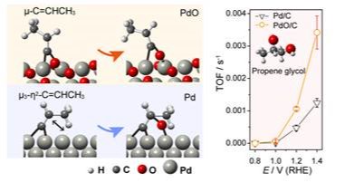 丙烯是一种重要的化工原料,每年全球需求超过1亿吨,主要用于生产环氧丙烷、聚丙烯、1,2-丙二醇等。传统上,丙烯的转化主要通过热催化方法。近年来,随着可再生电能快速发展,利用清洁电能在温和环境下进行丙烯电化学转化,引起了人们的关注。丙烯氧化的电位较低,若将其替代析氧反应,不仅能够显著降低电解制氢的能耗,还可得到高附加值的化学品。目前,贵金属Pd被认为是最有前景的丙烯电氧化催化剂之一,但反应机理仍不明确。