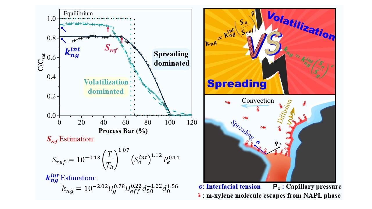 非水相液体(NAPL)到气体的相间传质过程是石化污染场地中包气带中有机污染物去除的主导机制。深入了解非水相液体(NAPL)到气体的相间传质过程与机理,对优化设计石化污染场地修复方案至关重要。在当前多孔介质中NAPL-g相间传质报道中,污染物尾气的浓度呈现两种不同的变化趋势:一是初始阶段尾气浓度快速下降并拖尾;另一种是在初始阶段多一个稳态阶段。那么NAPL-g相间传质模型化研究的关键在于:稳态的尾气浓度是由哪些关键因子控制?稳态和瞬态阶段是如何分配的?瞬态阶段的浓度变化趋势又是怎样的机制?
