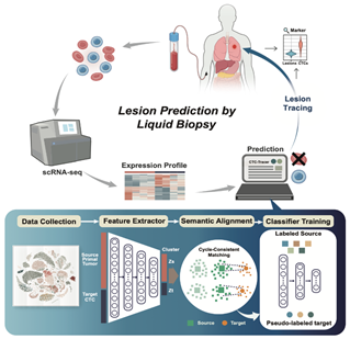 癌症是威胁人民生存的重大疾病,发展癌症诊疗新方法是国家的重大需求。现有癌症诊疗体系中,明确原发部位仍是进行标准化治疗的基础。但是,在临床上仍有3~5%的癌症是无法确定原发部位,它们称之为原发灶不明癌,是最常见的十大癌症之一,其死亡率位列第4。准确的识别患者的原发病灶位置有助于确定有效治疗方案,对于改善患者预后具有重要的意义。循环肿瘤细胞是从癌症的原发灶或者转移灶上脱落进入人体循环系统的一类癌症细胞,是癌症转移的前驱体。基于外周血循环肿瘤细胞检测的液体活检技术因其无创、灵敏度高,分子信息全等优势,近年来已经成为肿瘤筛查、伴随诊断和预后评估的一种新兴技术。课题组和合作团队基于深度迁移学习,并结合肿瘤细胞单细胞转录测序(scRNA-seq)图谱,实现了原发肿瘤细胞到CTC的知识迁移,突破了当前循环肿瘤细胞单细胞转录组图谱数据库匮乏的限制,高效精准地确定血液中CTCs对应的癌症原发病灶,为癌症病灶溯源提供了一种新思路。