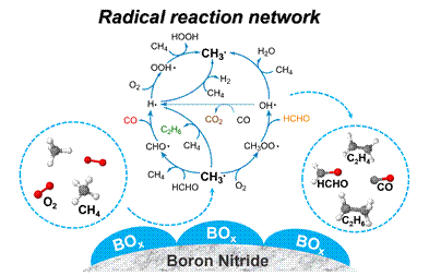 甲烷作为廉价、清洁的碳基资源,广泛存在于天然气、页岩气和可燃冰中。利用氧气将甲烷高选择性氧化为甲醇、甲醛等大宗化工平台分子是理想的甲烷转化利用方式之一。不过,由于甲烷分子的高度惰性,甲烷气相氧化反应通常需要在较苛刻的反应条件下进行,导致甲醇、甲醛等目标产物极易被进一步氧化为CO2。如何抑制深度氧化是甲烷选择氧化反应的核心挑战课题。近年来前沿研究表明,相较于传统金属氧化物催化剂,非金属硼基催化剂(如B2O3、BN等)在烷烃气相氧化反应中表现出独特的抗深度氧化能力,受到广泛关注。然而,文献中对该类催化剂的烷烃氧化反应机理,特别是最为惰性的甲烷分子的活化转化机制,仍存在较大争议,这严重阻碍了高性能硼基催化剂的理性设计与创制。