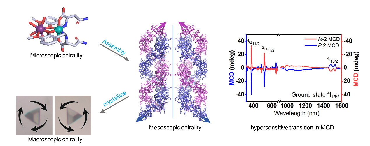 孔祥建教授团队近年来在稀土团簇的形成机理和模块组装方面开展了系统研究(J. Am. Chem. Soc. 2023, 145, 16983;J. Am. Chem. Soc. 2022, 144, 8837;J. Am. Chem. Soc. 2022, 144, 5653;Angew. Chem. Int. Ed. 2022, 61, e202200537;Angew. Chem. Int. Ed. 2022, 61, e202116296)。本工作基于前期研究基础,利用氨基酸衍生物构筑了手性分子模块基元[LnNiL2]+,该模块基元在配位键和氢键的驱动下组装成类似DNA的手性双螺旋结构。该组装体不仅有介观尺度的螺旋手性,其晶体也展现出手性几何形状,即宏观手性晶体。这表明手性在不同尺度上的连续传递,从微观手性碳原子、手性模块基元到介观螺旋二级结构,最终到宏观晶体的几何手性。X-射线单晶衍射分析和晶面关系研究揭示了手性晶体形成的两个关键因素:固有的晶面对称分布及其差异性的晶面生长速率。当手性分子中不同晶面族存在显著的生长差异时,就会导致结晶体的手性几何结构。此外,磁光响应研究表明,该双螺旋结构中稀土离子的超灵敏f-f跃迁显示出极强的磁光活性,以至于外加磁场可以翻转超灵敏跃迁处的CD信号方向。该研究不但揭示了超灵敏跃迁的强磁光活性,也为磁光材料的设计带提供了新思路。