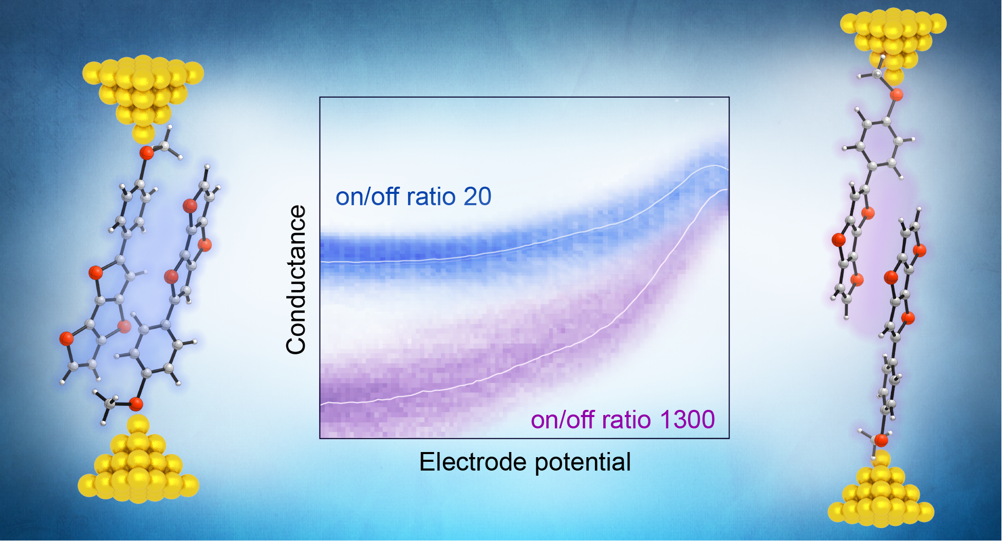 针对上述问题,我院洪文晶教授团队和兰州大学刘子桐教授合作,使用超分子材料作为单分子晶体管的导电沟道,并利用电化学门控-扫描隧穿裂结技术,成功构建了基于噻吩-苯共聚寡聚物(TPCOs)超分子沟道的超分子电化学晶体管。实验结果表明,与对应的单分子沟道相比,TPCOs超分子沟道的场效应性能表现出显著优势,而且随着并噻吩共轭面积的增大,TPCOs超分子沟道的场效应性能也明显提升。更重要的是,通过控制TPCOs超分子材料的堆叠构型会显著影响晶体管隧穿电子的量子干涉效应,从而调控其场效应性能。但如何实现对π-π堆积超分子构型的精确控制存在巨大挑战。研究团队通过精准控制源漏极两电极间纳米间距来调节超分子沟道堆积构型的实验策略,实现了对超分子沟道量子干涉效应的原位调控,发展了超分子沟道场效应性能的原位调控方法。利用这一实验策略优化超分子沟道构型后,研究团队成功地实现了开关比大于1000、源-漏极关态漏电流低至30 pA,且沟道长度小于2 nm的超分子晶体管。该工作揭示了超分子沟道材料优异的场效应性能,展示了使用具有原子级精确结构的超分子结构作为2纳米以下分子晶体管材料的潜力。
