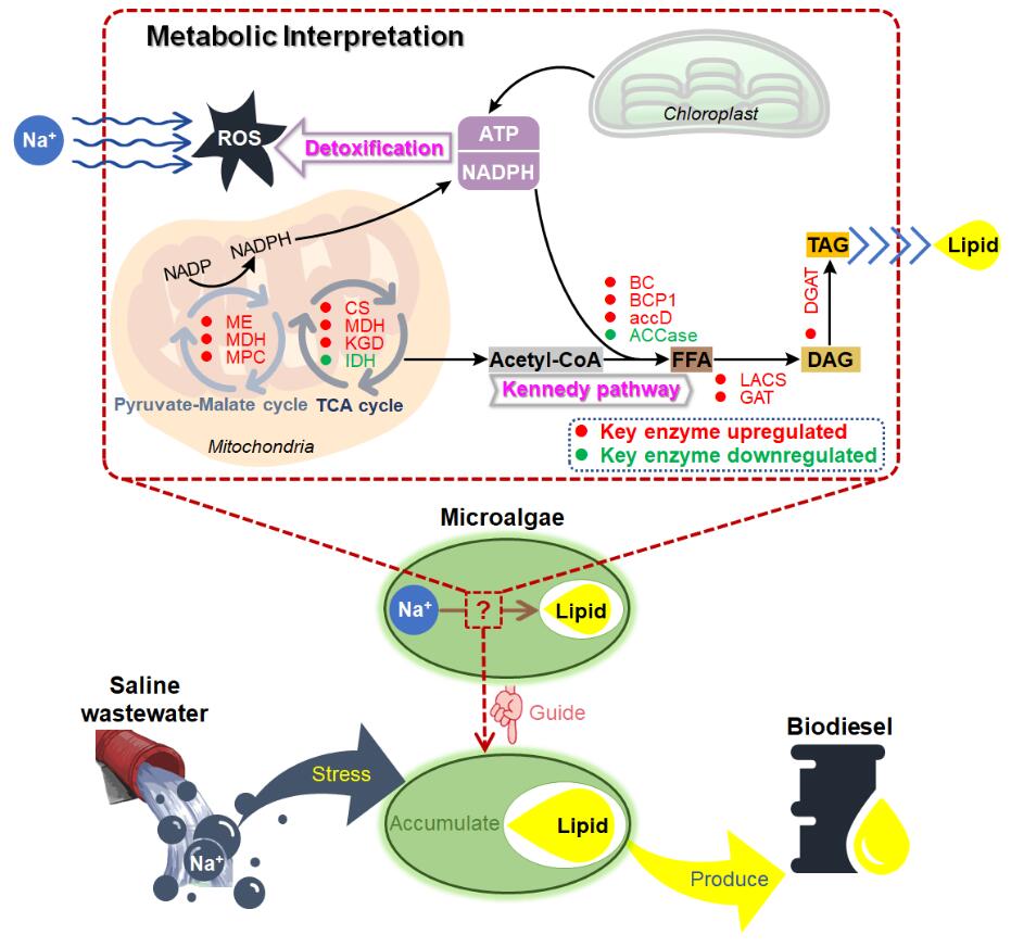 微藻油脂是生物柴油生产领域的重要原料之一。规模化微藻培养中,低产油率和高耗水量却使微藻生物质能源在生产源头即面临高成本制约。因此,以含盐废水取代淡水培养产油微藻,以盐度作为藻细胞脂质积累的调节因子,成为微藻生物质能源资源化循环利用的一种有效途径。然而盐分的增加是如何诱导微藻生成更多脂质的相关细胞调节机制尚不明晰。