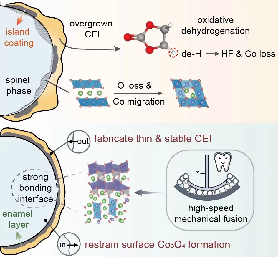 为此,我院乔羽教授课题组开发出一款简单、可规模化(一批250 g)的高速固相包覆工艺。以稳定的橄榄石材料为例,该工艺主要包括三个过程:(1)通过砂磨化前处理调控包覆材料粒径;(2)通过高速固相包覆过程中的机械融合作用实现和LCO曲率匹配、紧密结合的均匀包覆层;(3)通过高温煅烧后处理愈合包覆层颗粒之间、包覆层与LCO之间的晶界,实现晶格匹配的连续包覆层。经过全面表征与分析,研究团队证明了该包覆层的作用:(1)由电解液端到正极/电解液界面处,这种釉质类包覆层通过抑制电解液溶剂的氧化脱氢,有助于形成薄、稳定的CEI膜;(2)由正极体相到近表面处,包覆层和LCO之间的强键和作用可通过抑制表面释氧,从而减少层状向尖晶石的表面相变。该研究提出的包覆工艺建立起一套新型技术范例,为大规模、经济性生产稳定的高比能正极材料开辟了新道路。