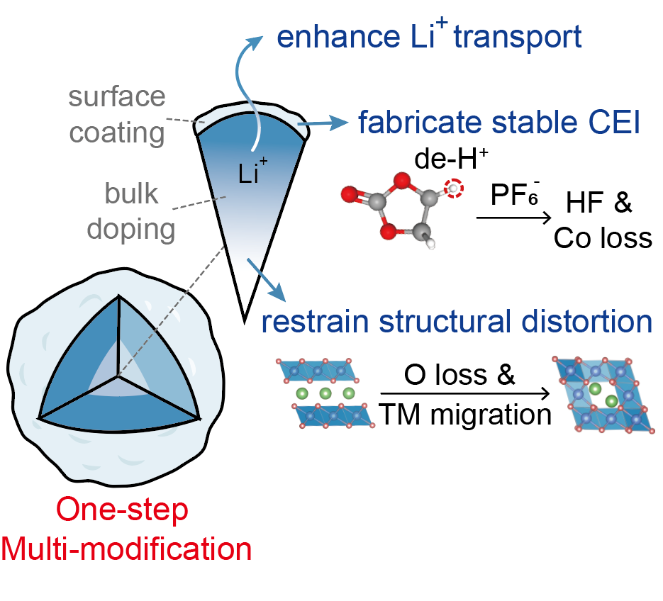 高压LCO除表界面不稳定外,还存在体相结构畸变问题,因此采用单一的传统改性策略(如掺杂或者包覆)无法全面解决上述不稳定性问题;且新型改性策略(如构筑梯度构型:高容量/活性中心+低容量/活性表面),难以通过简易的一步法合成来实现。
