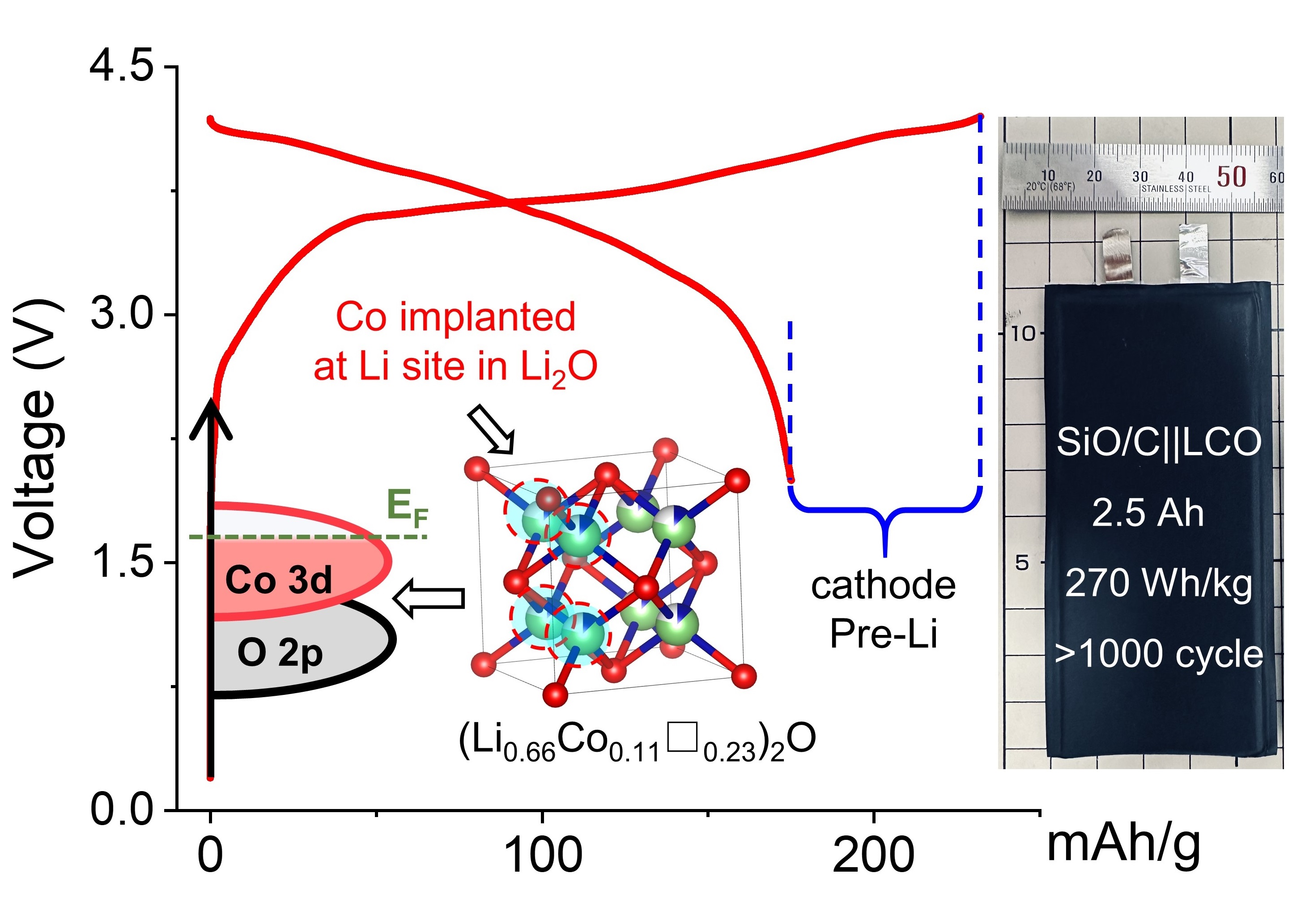 为满足高功率应用(如电动汽车)的需求,提高锂离子电池(LIBs)的能量密度变得尤为重要。全电池结构中负极形成的固体电解质界面(SEI)会消耗大量活性锂离子,降低首圈库仑效率(ICE)和实际输出的能量密度。在从商业石墨负极到其它先进的高容量负极的演变中,SEI的形成加剧了活性锂的消耗。仅仅通过调整正极截止电位获得的容量提高,并不足以弥补负极初始循环中活性锂的损失,这严重限制了下一代LIBs能量密度的提高。正极补锂是通过植入牺牲型锂源来提供额外的锂离子,用于补偿形成SEI所消耗的活性锂,从而实现能量密度的提高。Li2O等物质被认为是正极补锂剂的候选者,但由于其电导率差和电化学活性低,难以在实际应用中释放其高理论容量。