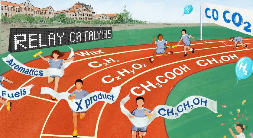 该综述系统介绍了接力催化在CO、CO2选择性加氢制备清洁液体燃料和高值化学品反应中的潜力和优势。在传统催化剂上,该类反应过程复杂并涉及多种中间体和反应通道,往往不可避免地生成大量低值副产物。接力催化的内涵在于设计单一的反应通道,通过选择适当的中间体以及在介尺度组装催化功能组分,实现对这些中间体反应步骤的精准控制,像接力一样引导反应物依序逐步转化至目标产物。接力催化体系主要由金属或金属氧化物(用于CO/CO2/H2活化)和沸石催化剂(用于C−C偶联/重构)组成,并根据目标产物的特性,引入第三甚至第四催化功能组分。该综述详细讨论了金属或金属氧化物上CO/CO2/H2的活化机制、沸石催化剂对产物选择性的调控规律、接力催化反应中热力学-动力学匹配、催化剂功能组分之间的空间距离效应,以及反应中间体的定向传输等关键问题,并对接力催化的发展趋势和相关应用前景进行了展望。