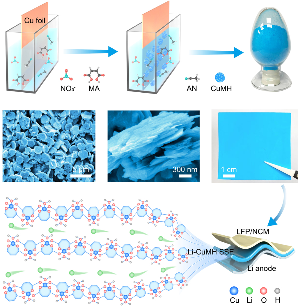 研究工作通过自下而上的自组装方法合成一水合马来酸铜配合物纳米片,该纳米片具有高度有序的一维通道,通道由Cu2+/Cu+节点和马来酸配体连接构成,富含COO-基团和结晶水。基于离子跃迁和偶联-解离协同机制,Li+可在上述一维通道内高速传输。因此,马来酸铜水合物固态电解质展示出优异的离子电导率(室温1.17 × 10−4 S cm−1)、高Li+迁移数(0.77)和宽工作电压窗口(0-4.7 V)。这项工作为探索基于传统金属配位化合物的室温快离子导体提供了全新思路。