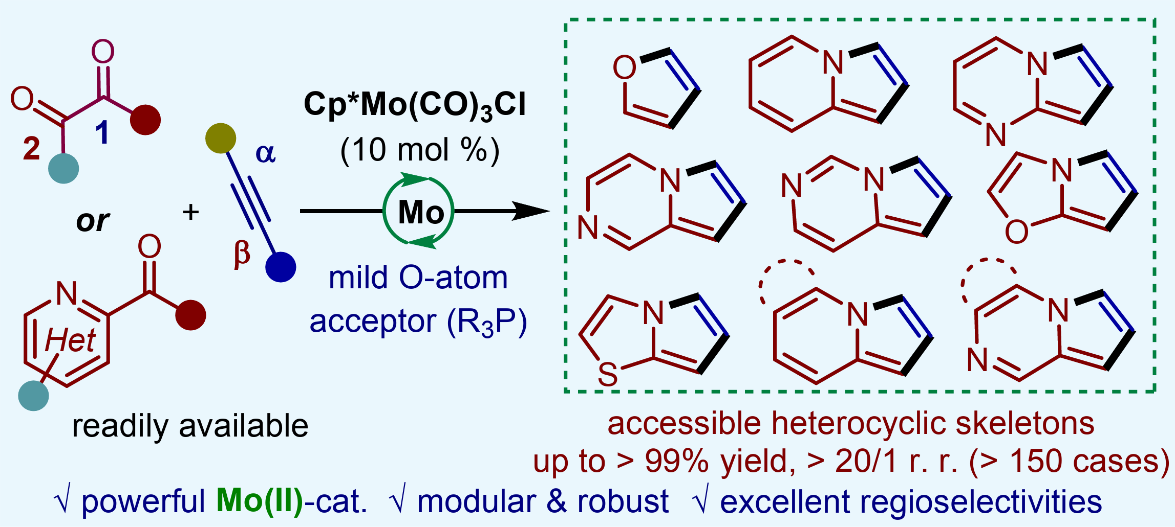 卓春祥课题组一直致力于发展新型钼催化的羰基直接脱氧官能团化反应(Angew. Chem. Int. Ed. 2021, 60, 15254; ACS Catal. 2022, 12, 11428; J. Am. Chem. Soc. 2023, 145, 2765; J. Am. Chem. Soc. 2023, 145, 8781; Org. Chem. Front. 2023, 10, 3544)。前期发展的羰基脱氧官能团化反应主要依赖于使用邻苯醌氧化零价Mo(CO)6或者使用膦作为还原剂还原六价手性salen-Mo的低价钼催化体系。由于这些催化体系均需经过氧化或还原的预活化才能生成活性低价钼物种,课题组设想发展一类稳定、易于获取且能直接用于羰基脱氧官能团化反应的低价钼催化剂,并于近日报道了一类稳定、易得的Cp*Mo(II)催化剂作为新型、高效的羰基脱氧催化剂,并用于催化羰基化合物和炔烃的分子间直接脱氧偶联反应。该反应能够以高化学选择性、高区域选择性、中等到优秀的收率得到一系列杂芳环产物(10类不同杂环化合物)。