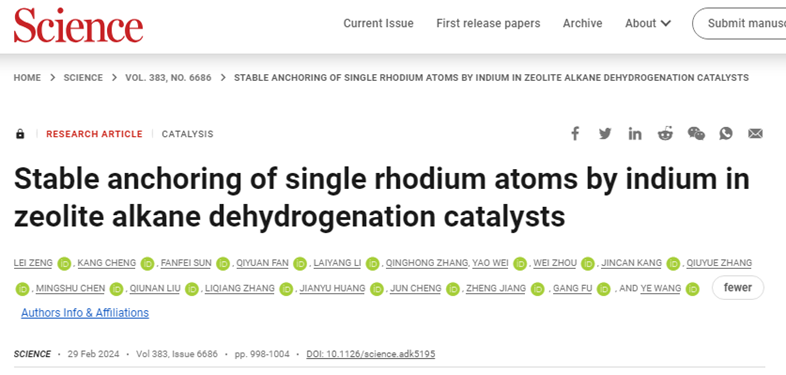 我院王野教授、傅钢教授和上海光源姜政研究员(现中国科学技术大学教授)等利用铟元素在反应条件下的动态迁移特性和铑单原子的高效C-H键活化能力,创制出高达5500小时以上寿命的超高稳定性In/Rh@S-1催化剂,在近热力学平衡收率条件下高选择性催化丙烷等低碳烷烃直接脱氢制取对应烯烃。相关成果以“Stable anchoring of single rhodium atoms by indium in zeolite alkane dehydrogenation catalysts”为题于2024年3月1日发表在Science 期刊 (2024, 383, 998-1004)。